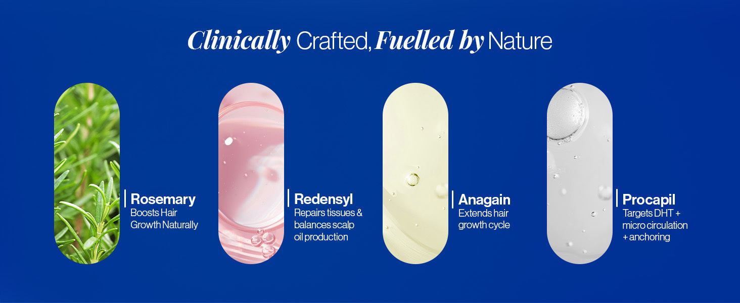 Redensyl is a breakthrough compound known to “wake up” sleeping follicles by activating stem cells in the hair bulge region. It pushes hair back into the anagen phase (growth mode), helping new baby hairs sprout where growth had stalled.
